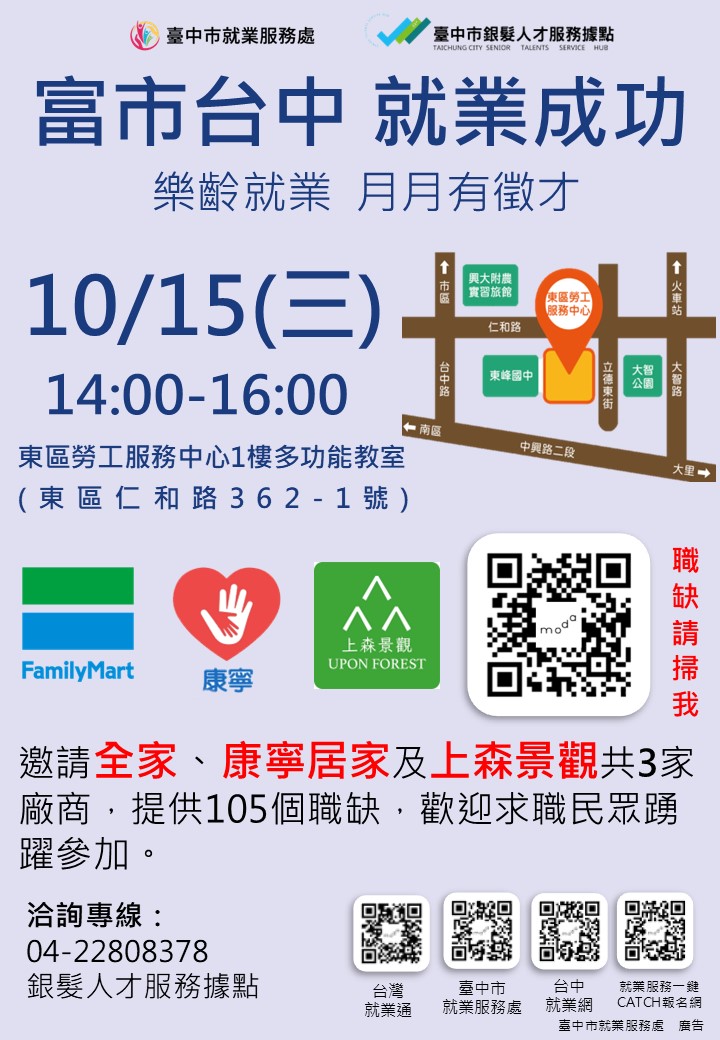 10/15(三) 臺中市政府2025「富市台中就業成功」樂齡就業 月月有徵才