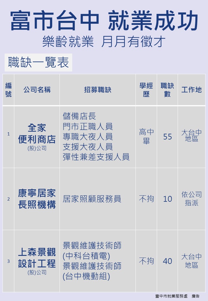 • 發布單位: 臺中市就業服務處‧臺中就業服務站