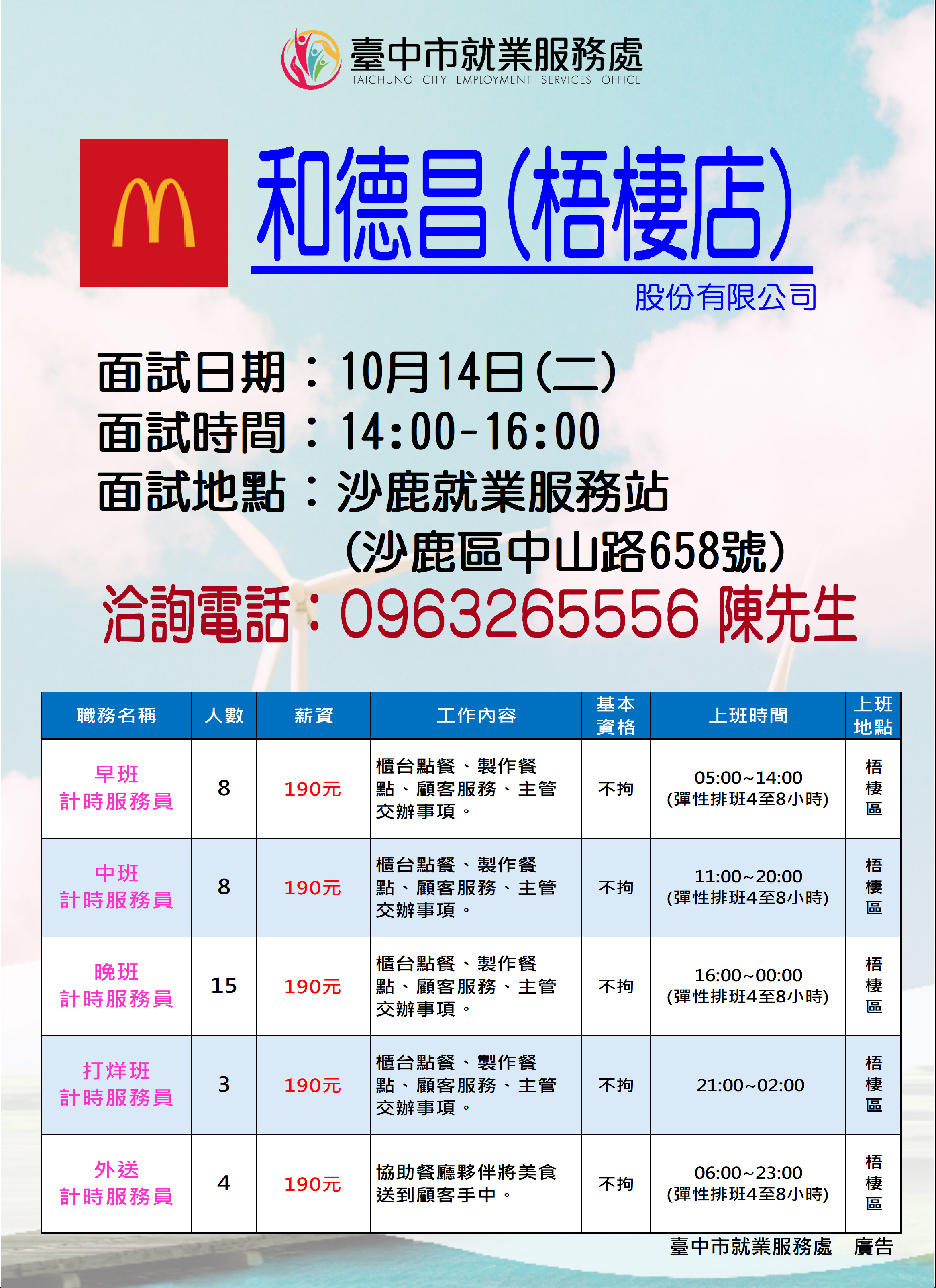 10/14(二)和德昌股份有限公司-梧棲店 單一廠商徵才活動