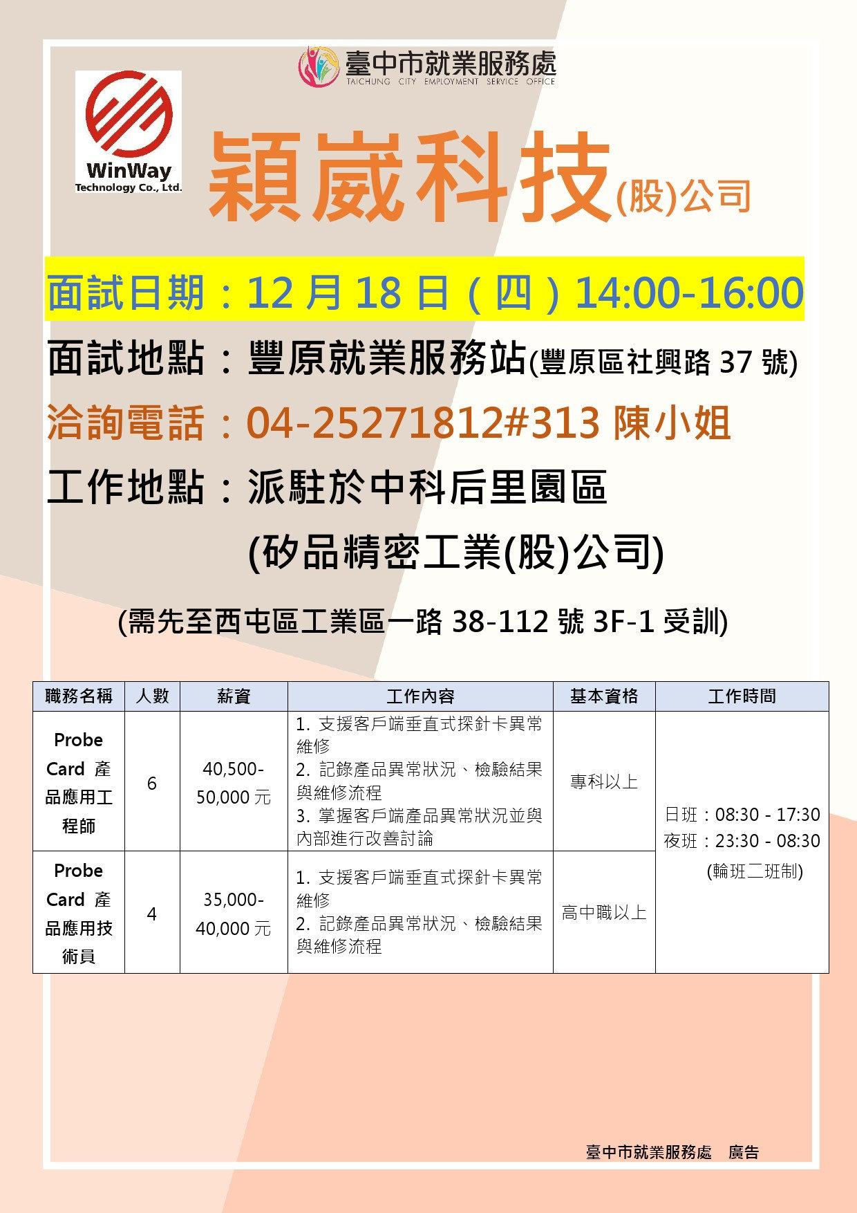 12/18(四)穎威科技股份有限公司單一徵才活動