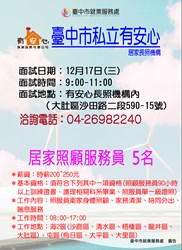 性 質:單一廠商徵才活動 活動日期:12/17(三)9:00-11:00 活動地點:有安心居家長照機構內(大肚區沙田路二段590-15號) 廠商名稱:有安心長照服務有限公司臺中市私立有安心居家長照機構 廠商地址:台中市大肚區沙田路二段590-15號 工作地址:海2區(臺中市沙鹿區、清水區、梧棲區、龍井區、大肚區) 屯區(台中市烏日區、太平區、大里區) 職 缺:居家照顧服務員(5人) 工作內容:照服員案家身體照顧、家務清潔、陪同外出、喘息服務 工作時間:08:00-17:00 基本資格:須符合下列其中一項資格(照顧服務員90小時以上訓練證書、護理相關科系畢業、照服員單一級證照) 薪資待遇︰時薪200~250元 |