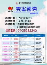 性 質:單一廠商徵才活動 活動日期:12/10(三)14:00-16:00 活動地點:沙鹿就業服務站(沙鹿區中山路658號) 廠商名稱:雲雀國際股份有限公司 廠商地址:臺北市南港區松河街410號4樓 工作地址:臺中市梧棲區台灣大道十段168號(三井OUTLET) 職 缺 一:儲備店經理(5人) 工作內容:店務領導與管理能力、負責任、主動積極、有危機處理能力。 工作時間:09:00-23:00(排班8小時) 基本資格:高中職畢 薪資待遇︰40,000元~45,000元 職 缺 二:儲備店主廚(5人) 工作內容:預估各專案成本,並擬定預算、時程規劃及品質管理、執行與追蹤檢討。 工作時間:09:00-23:00(排班8小時) 基本資格:高中職畢 薪資待遇︰40,000元~45,000元 職 缺 三:外場正職人員(30人) 工作內容:顧客餐飲服務、收銀接待服務。 工作時間:09:00-23:00(排班8小時) 基本資格:高中職畢 薪資待遇︰33,000~37,000元 職 缺 四:內場正職人員(30人) 工作內容:食材備料及餐點製作。 工作時間:09:00-23:00(排班8小時) 基本資格:高中職畢 薪資待遇︰33,000~37,000元 職 缺 五:外場兼職人員(30人) 工作內容:顧客餐飲服務、收銀接待服務。 工作時間:09:00-23:00(彈性排班4-7小時) 基本資格:高中職畢 薪資待遇︰200~274元/時薪 職 缺 六:內場兼職人員(30人) 工作內容:食材備料及餐點製作。 工作時間:09:00-23:00(彈性排班4-7小時) 基本資格:高中職畢 薪資待遇︰200~274元/時薪 職 缺 七:中央廚房人員(5人) 工作內容:製作各業態餐廳食材。 工作時間:06:00-18:00(排班8小時) 基本資格:高中職畢 薪資待遇︰33,000~37,000元 工作地址:臺中市神岡區中山路976號 職 缺 八:兼職倉儲物流配送司機(5人) 工作內容:物品的理貨、包裝、配送。 工作時間:05:00-15:00(彈性排班4-7小時) 基本資格:高中職畢,具普通汽車駕照 薪資待遇︰230~284元/時薪 工作地址:臺中市神岡區中山路976號 |