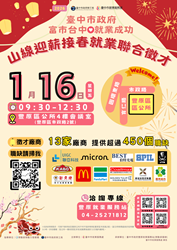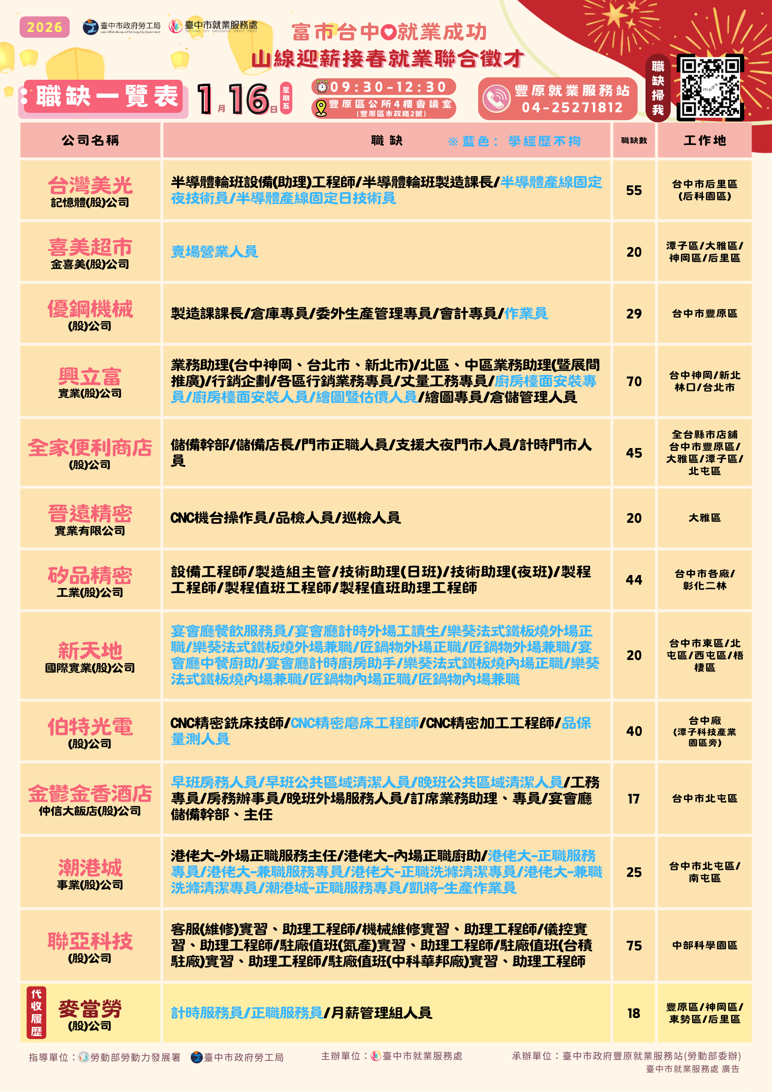 🔊邀請台灣美光、聯亞科技、全家便利商店及新天地等共13家廠商, 提供超過450個工作機會,歡迎市民朋友踴躍參加。