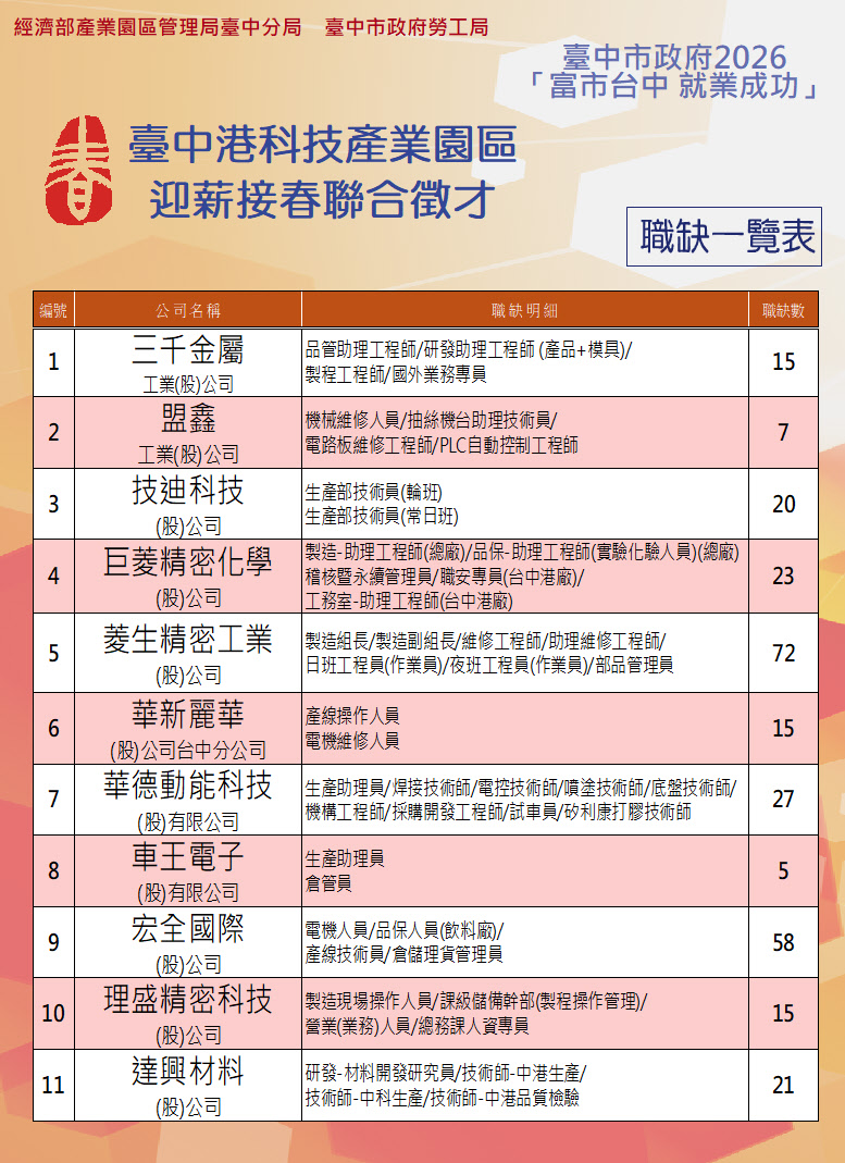- 活動內容:邀請三千金屬、盟鑫工業、技迪科技、巨菱精密、車王電子、華新麗華、華德動能、菱生精密、宏全國際、理盛精密及達興材料等11家廠商,共278個工作機會,歡迎市民踴躍參與!