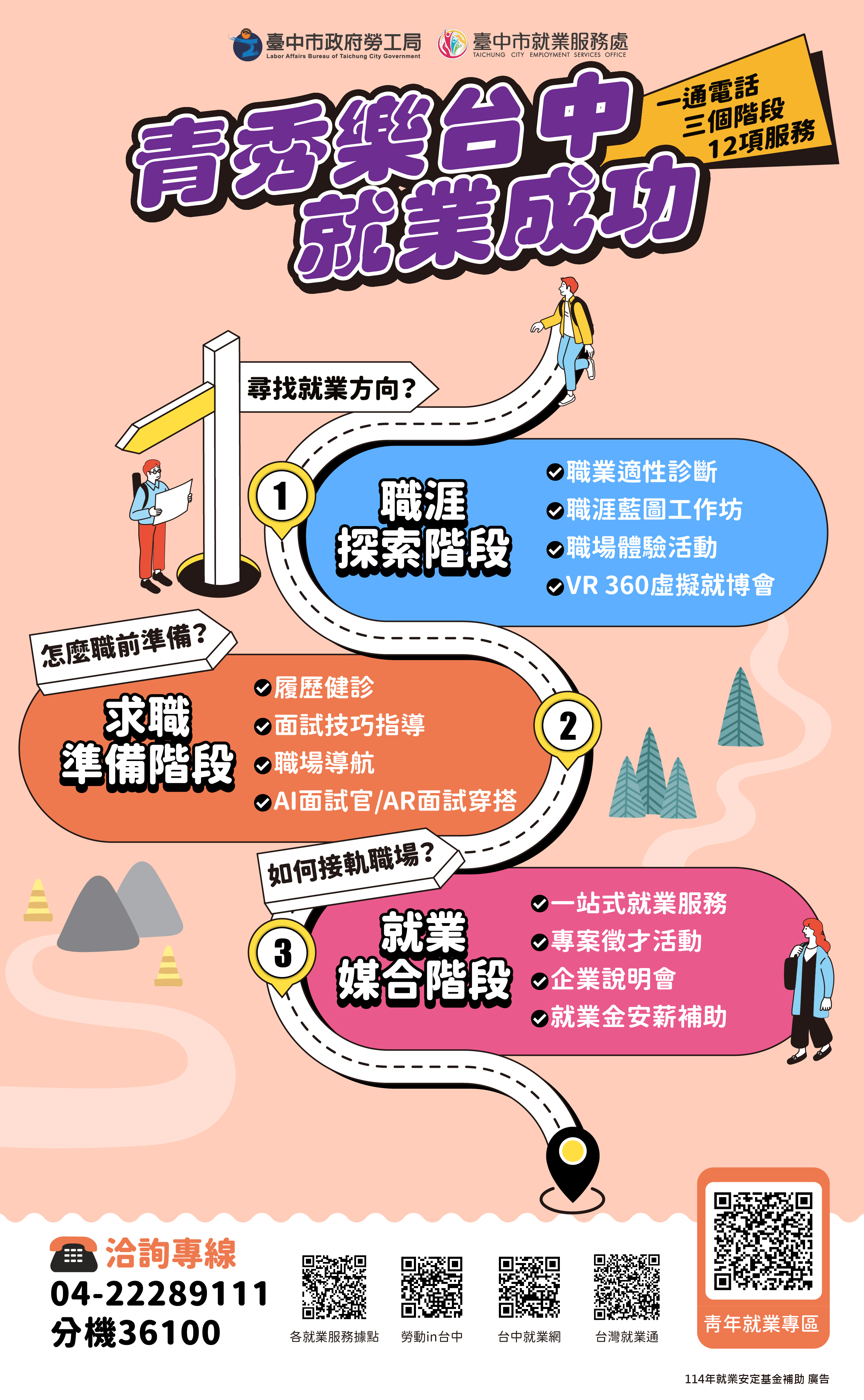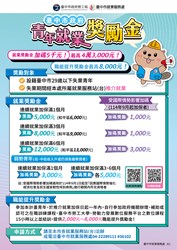 市長盧秀燕高度重視青年就業議題,勞工局長林淑媛表示,市府推動「青秀樂台中 就業成功」方案,依青年需求規劃職涯探索、求職準備及就業媒合三大服務階段,提供職業適性診斷、職場體驗、履歷健診、AI面試官等多元協助;並結合「獎勵青年就業計畫」,提供穩定就業獎勵金最高可達4萬3千元!此外,另推出「職能提升獎勵金」,鼓勵青年於就業一年內持續進修,最高可再領8千元。