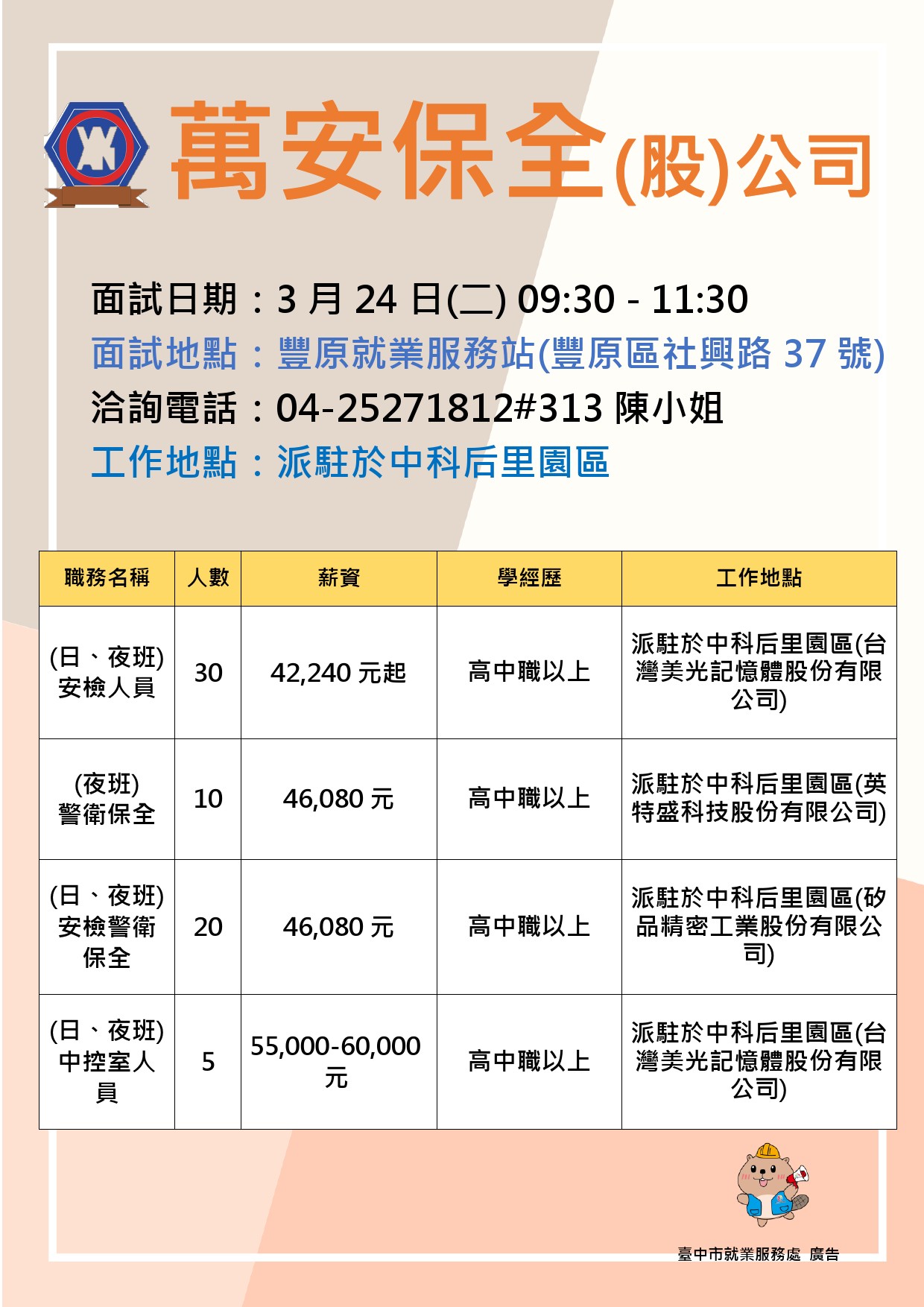 🔎職缺一:(日、夜班)安檢人員(月薪制/30名)