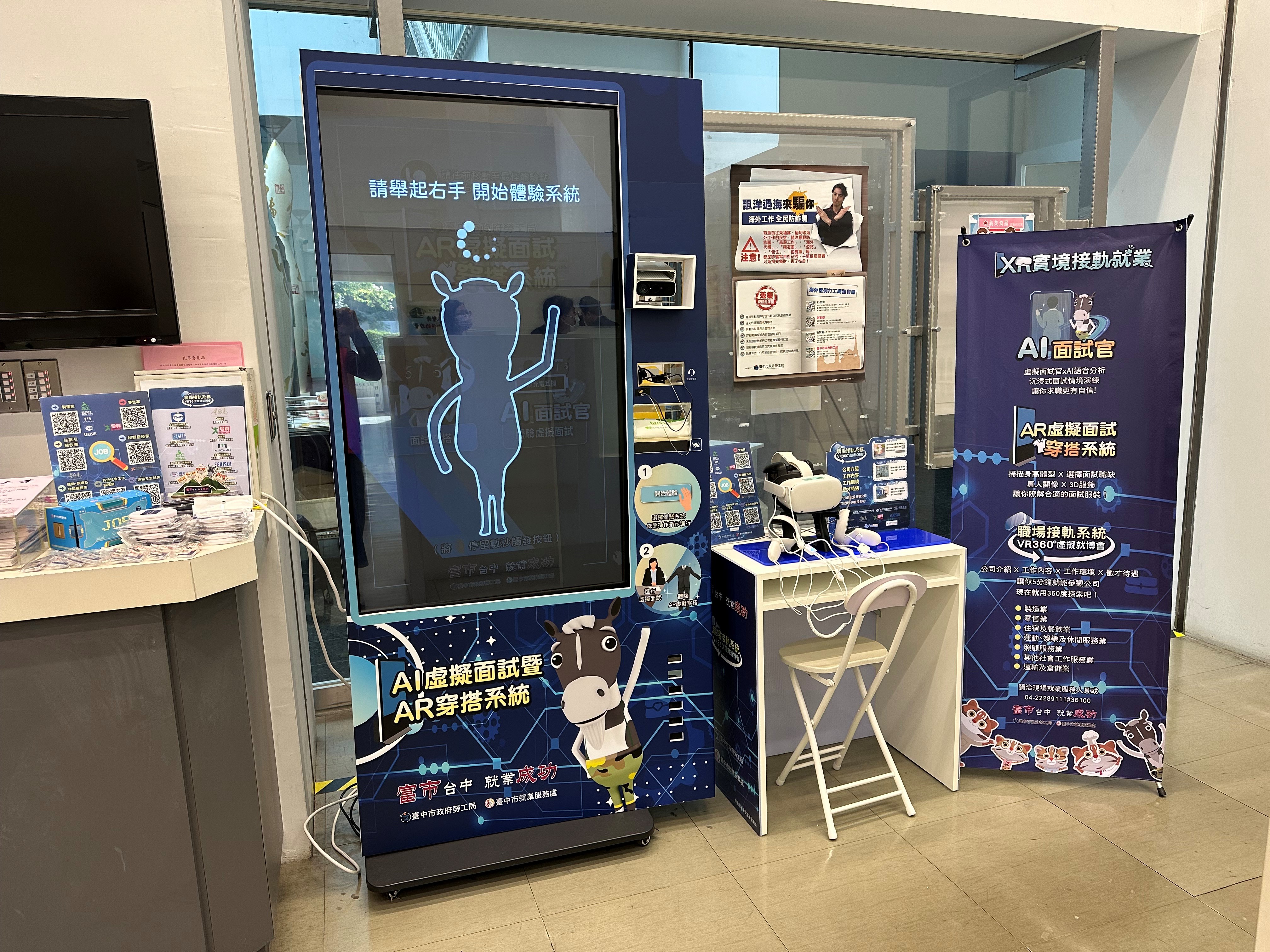 市長盧秀燕重視市民就業,勞工局長林淑媛表示,市府因應數位趨勢導入 AI 與 VR 科技,推出「VR 360度職場接軌系統」,讓求職者透過沉浸式體驗「先上班看看」,掌握環境與待遇後直接連結「台中就業網」投遞履歷。此外,首度推出的「AI虛擬面試官」則模擬真實面試情境,助市民透過實戰演練優化應對技巧、降低面試焦慮並建立自信,全面強化就業競爭力,順利接軌職場。