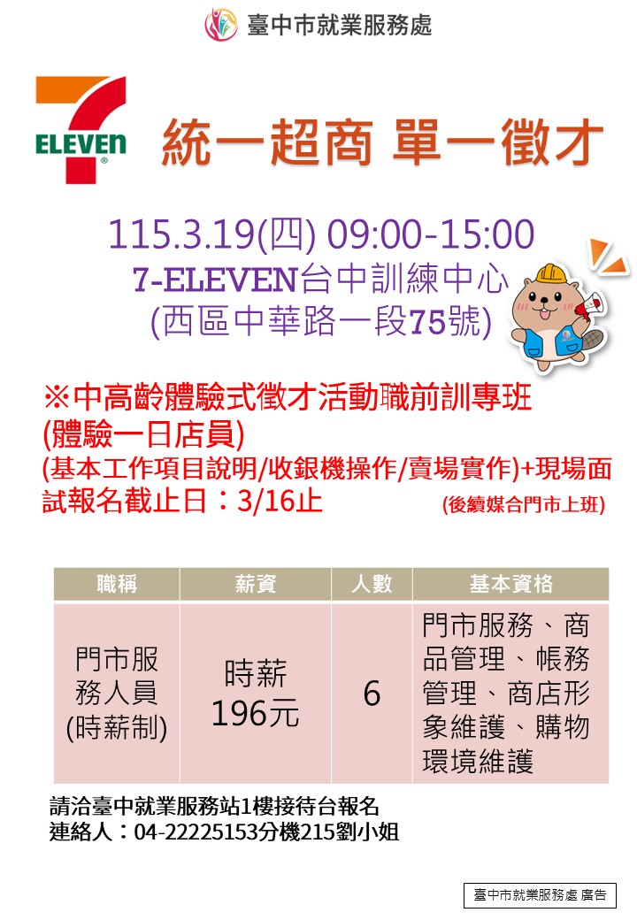 • 發布單位: 臺中市就業服務處