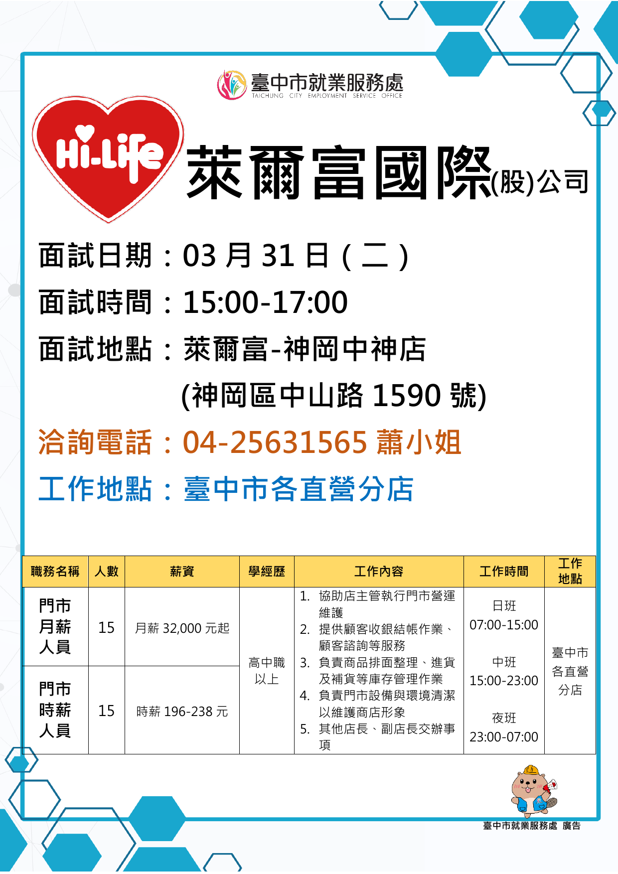 🔎職 缺 二:門市時薪人員(時薪制/15名)