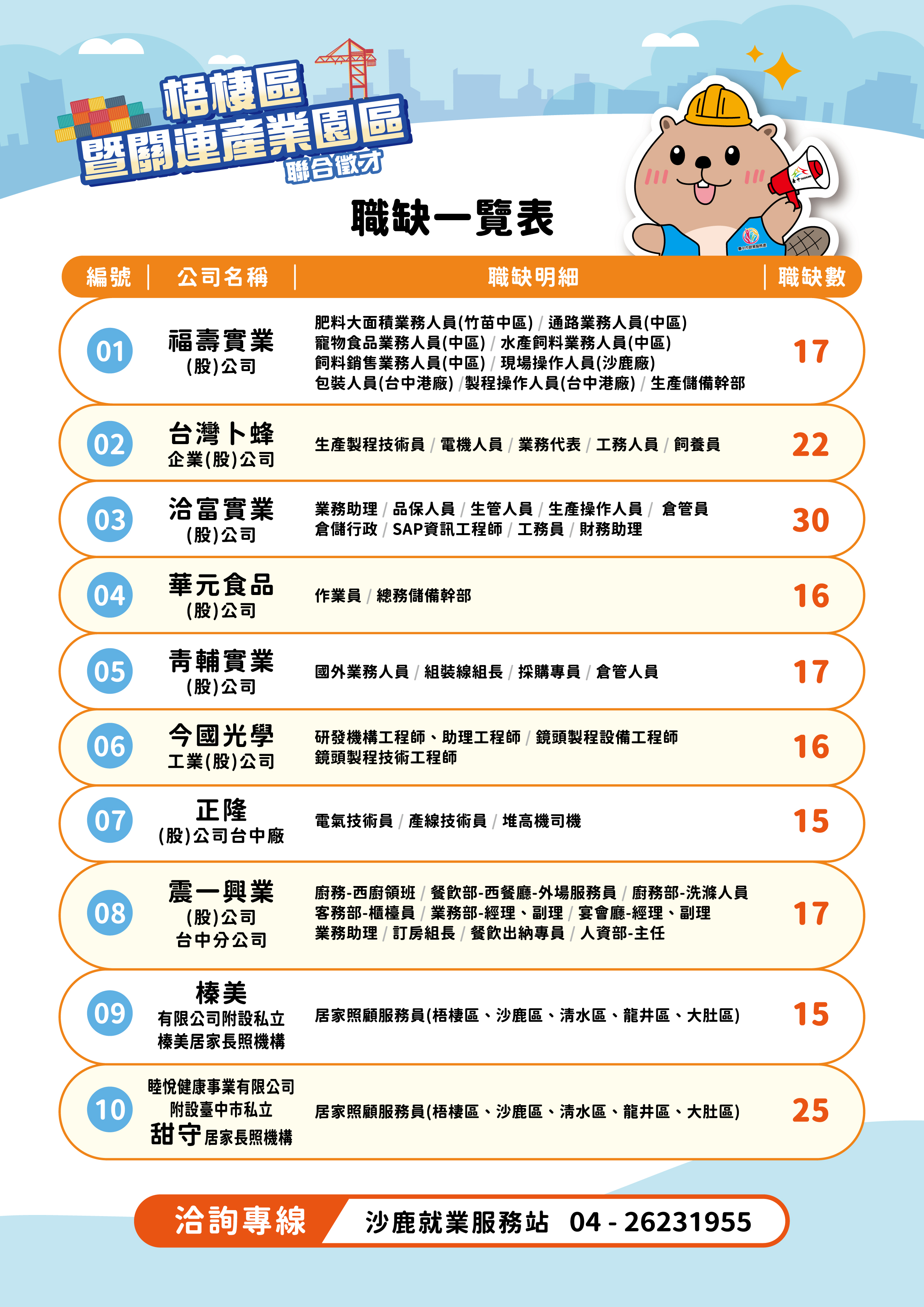 勞工局長林淑媛指出,梧棲區鄰近關連產業園區、台中產業科技園區及自由貿易港區等多處產業聚落,此次參與廠商橫跨食品製造、農畜加工、製造業及長期照顧服務產業,包含福壽實業、台灣卜蜂、洽富實業、華元食品、青輔實業、今國光學、正隆台中廠、震一興業,以及榛美與甜守居家長照機構等,職缺橫跨基層作業到專業技術職務,部分職缺亦提供完善教育訓練與升遷制度,適合青年朋友及正在尋職民眾投入發展,長照相關職缺更呼應高齡化社會趨勢,提供有志投入照顧服務產業者穩定就業選擇。