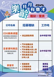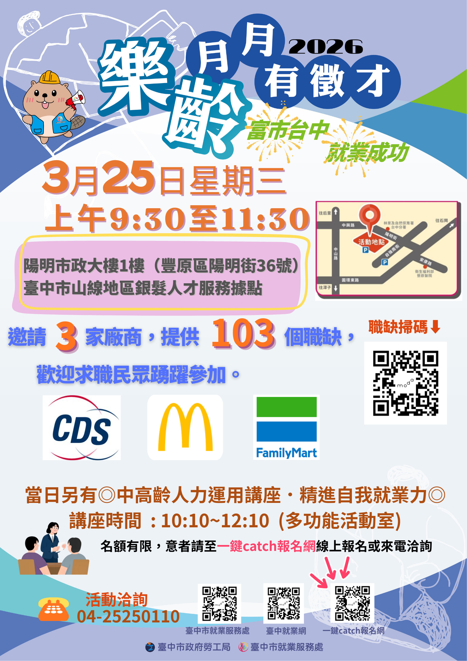 03/25(三)臺中市政府2026「富市台中 就業成功」 樂齡就業月月有徵才