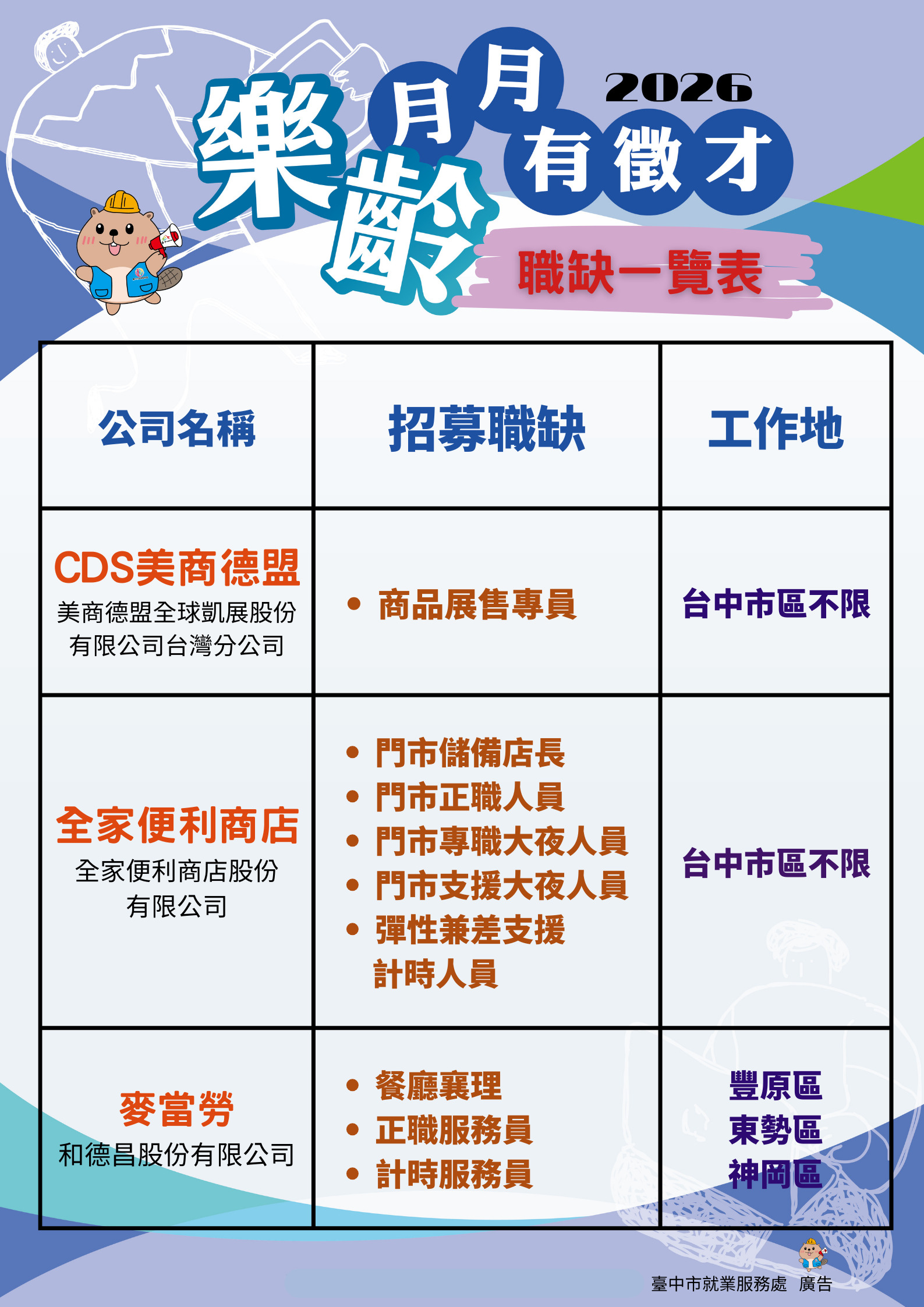 2026「富市台中 就業成功」樂齡就業月月有徵才