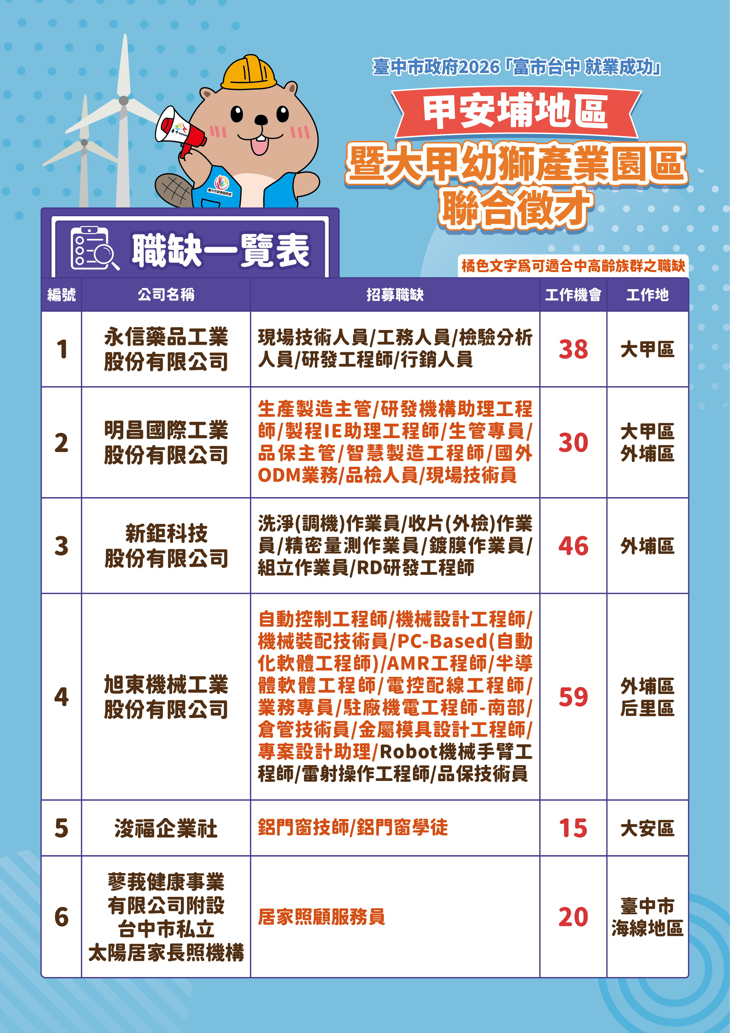 勞工局長林淑媛表示,甲安埔地區及大甲幼獅產業園區為台中市重要產業聚落之一,市府持續透過辦理聯合徵才活動,協助企業補實人力需求,並讓市民就近就業,減輕通勤壓力,提升就業穩定度。此次活動邀請永信藥品、明昌國際、旭東機械、太陽長照居家等6家廠商參與,提供多元職缺,協助求職民眾依不同專業背景進行媒合。