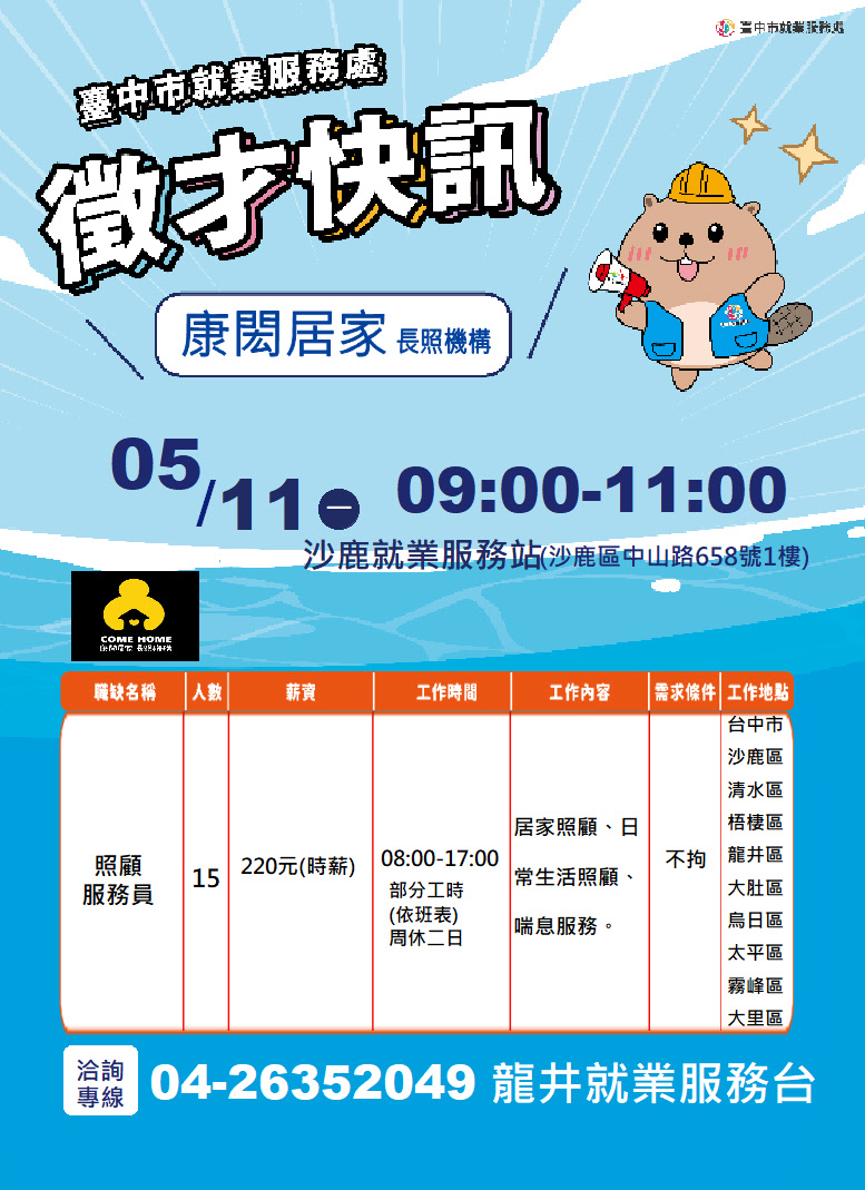 工作地點:台中市沙鹿區、清水區、梧棲區、龍井區、大肚區、烏日區、太平區、霧峰區、大里區