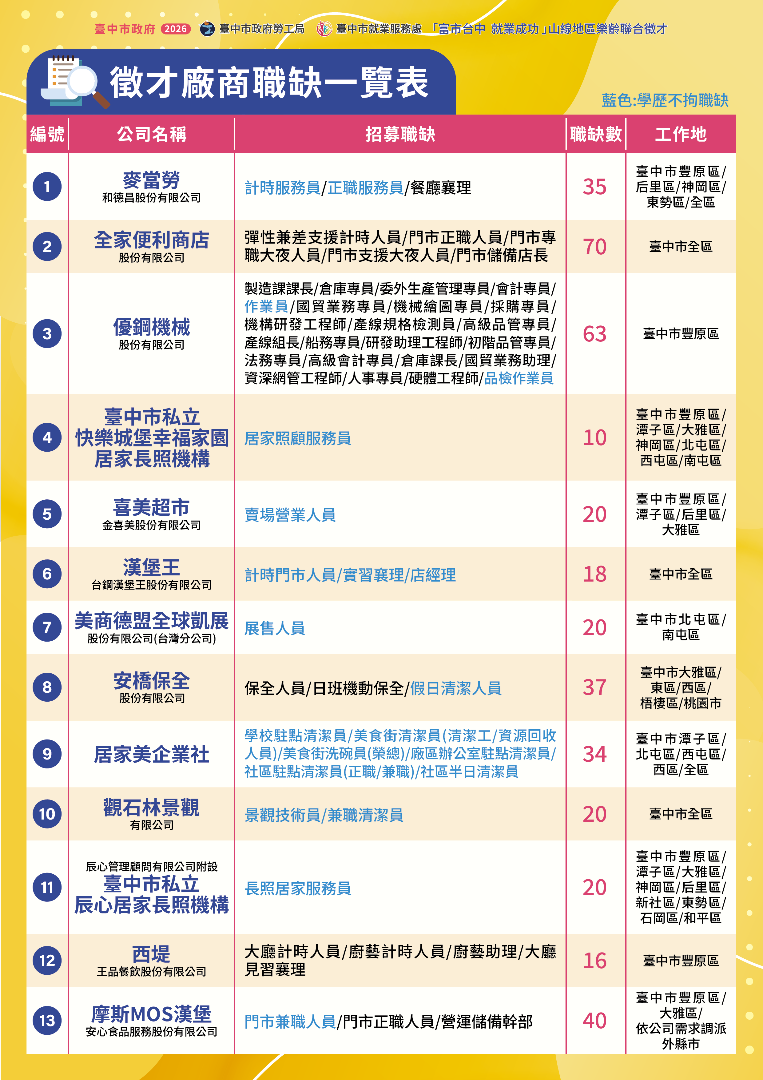• 活動內容:邀請王品、麥當勞、全家便利商店及美商德盟13家企業,提供超過400個職缺,歡迎踴躍參加。