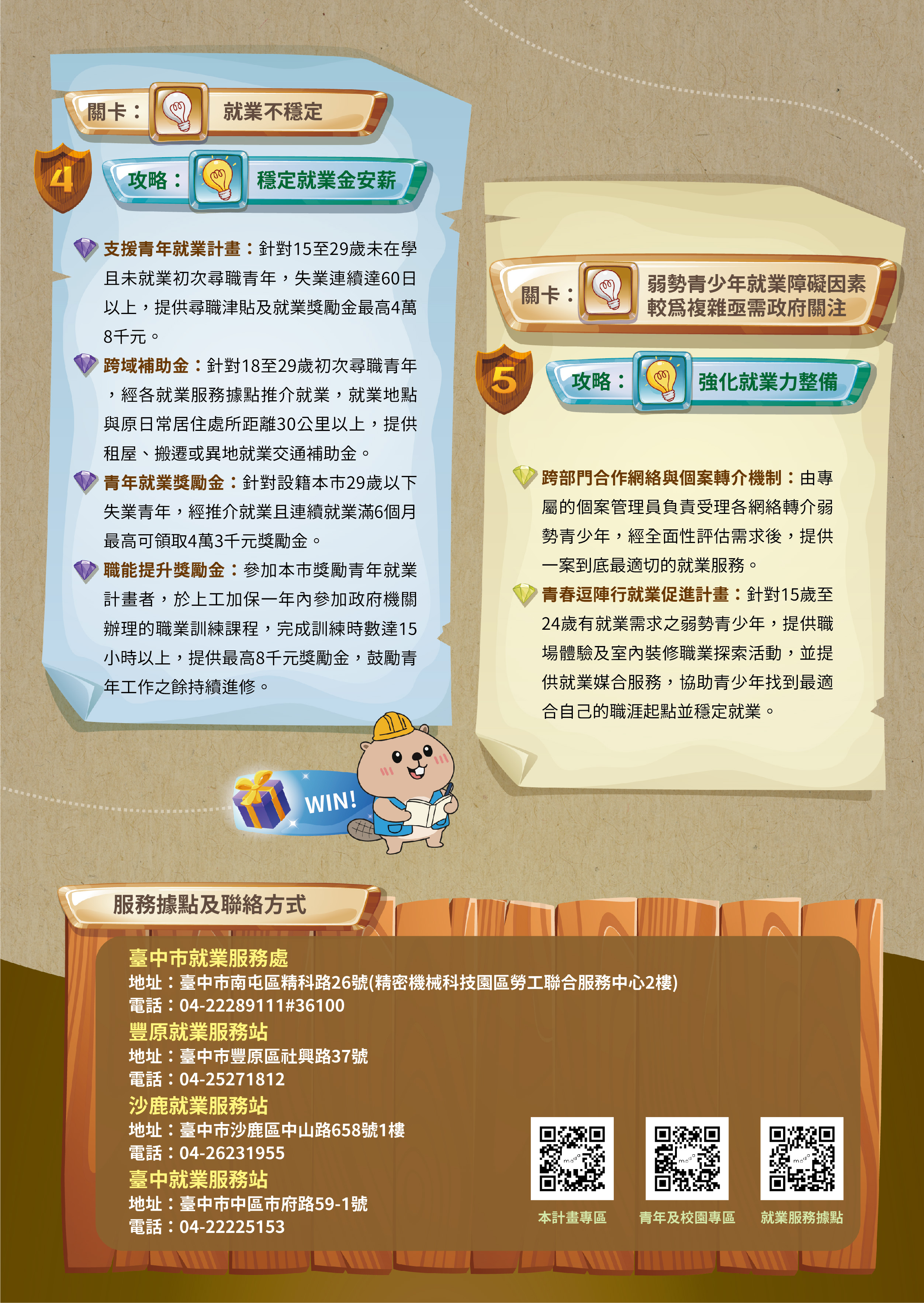 2.青春逗陣行就業促進計畫 (另開新視窗):針對15歲至24歲有就業需求之弱勢青少年,提供職場體驗及室內裝修職業探索活動,並提供就業媒合服務,協助青少年找到最適合自己的職涯起點並穩定就業。
